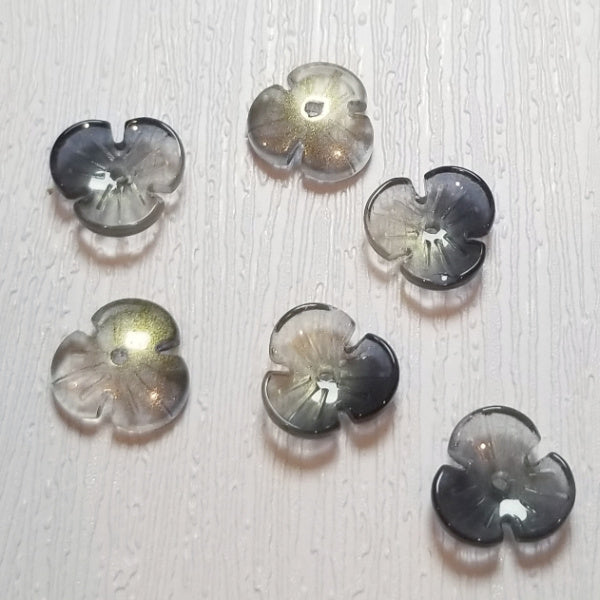 These dramatic navy-to-clear glass 3 Petal flower beads bloom with subtle intensity. The transparent glass lets light shine through while the dark inky edges ground your design. Slight golden shimmer at the center adds quiet depth. These are statement-making and versatile, Bold without being loud.